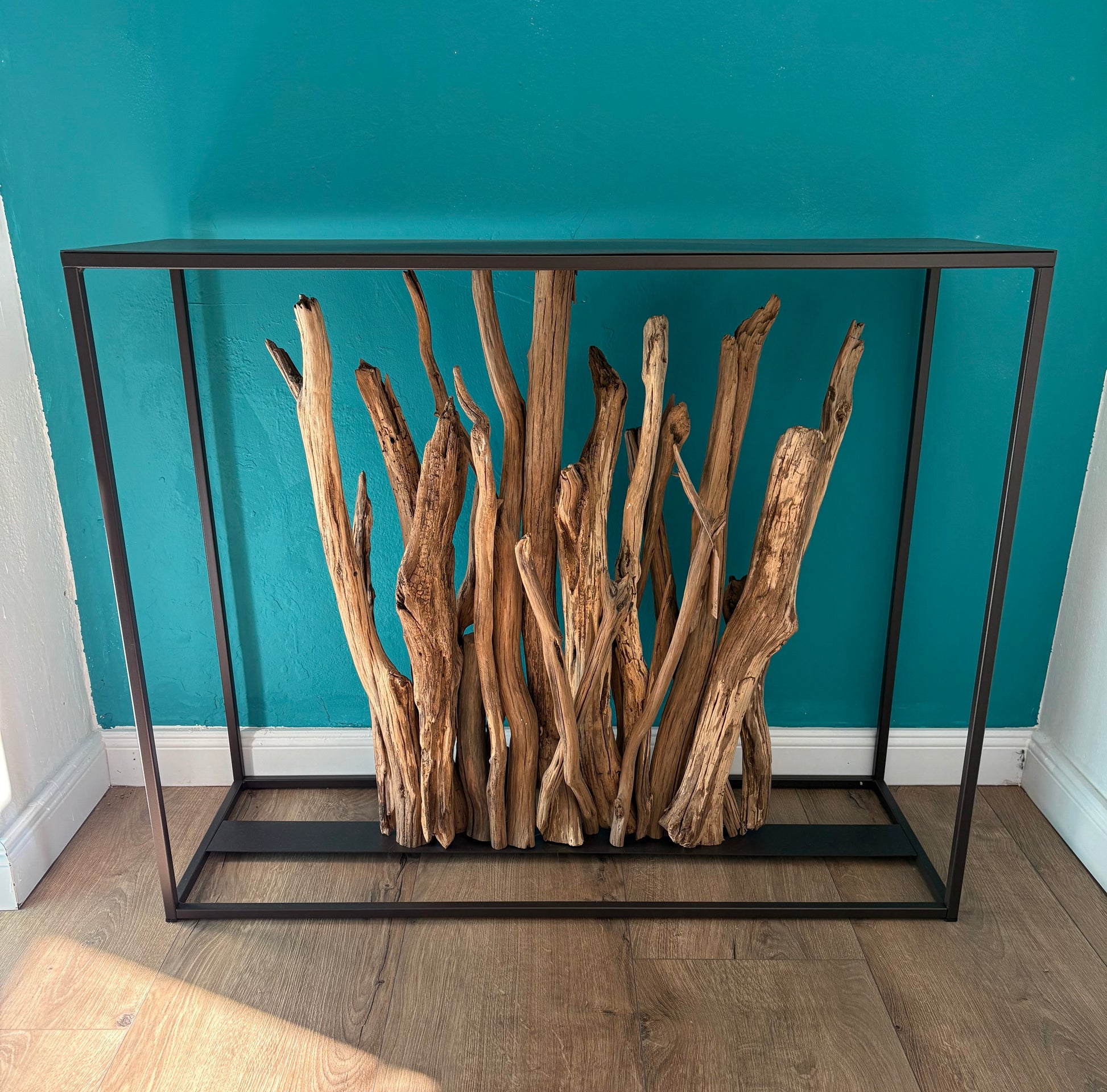 Natürliches Flair trifft auf urbanen Chic! Die Konsole „Urban Timber“ vereint einen pulverbeschichteten schwarzen Metallrahmen mit innenliegenden Holzstämmen aus Eiche Bruchholz und schafft so ein modernes, zugleich warmes Wohnambiente. Das außergewöhnliche Design macht die Konsole zu einem stilvollen Blickfang im Flur, Wohnzimmer oder Arbeitsbereich – perfekt, um Dekoration, Bücher oder persönliche Schätze wirkungsvoll in Szene zu setzen.