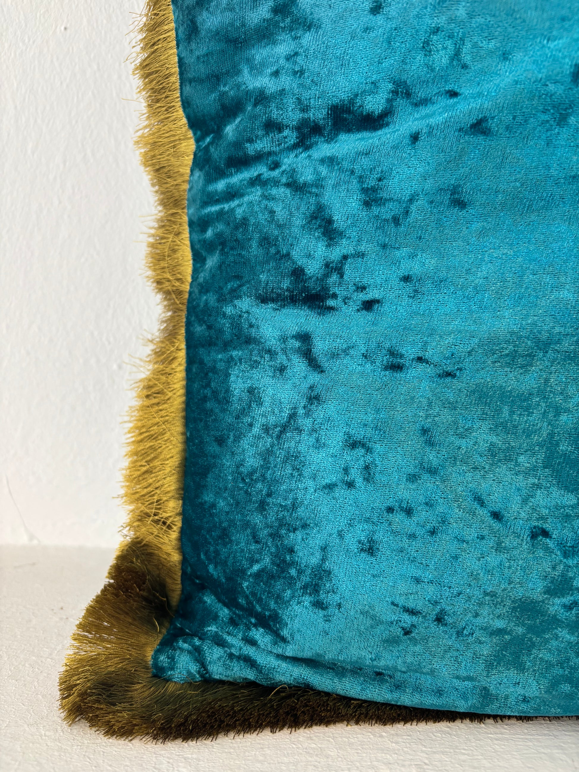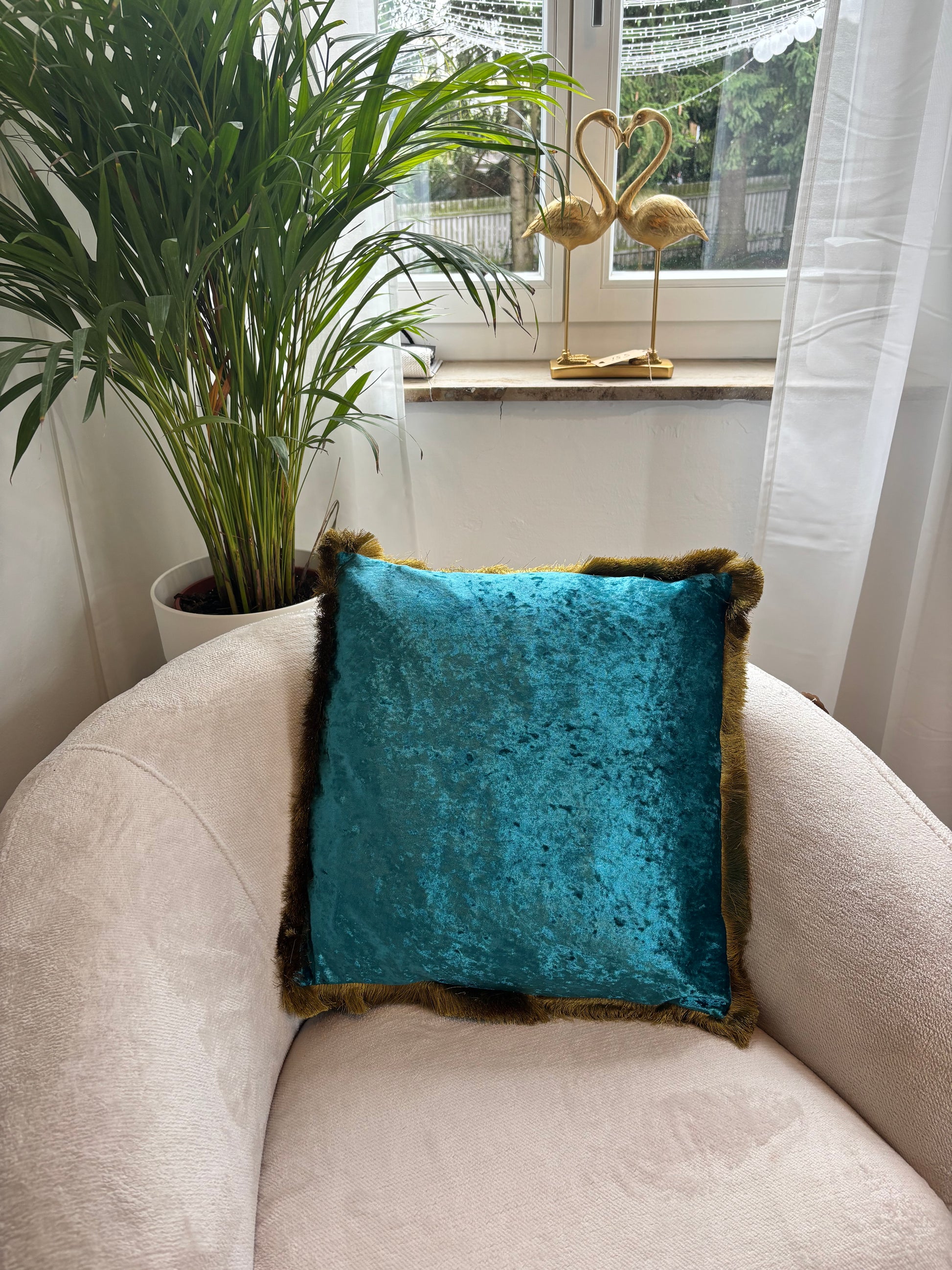Samtkissen „Riviera“ – 45 × 45 cm, Petrol mit Fransenkante